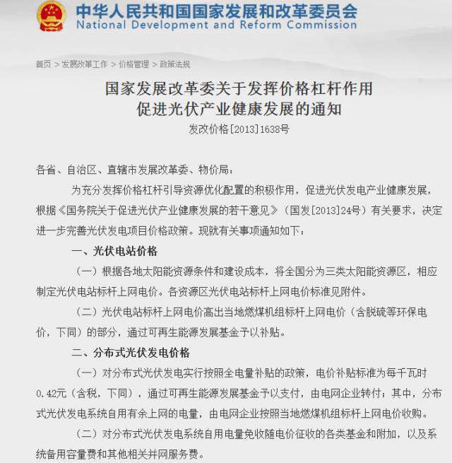 2013年8月26日国家发改委发布的发改【2013】1638号文件。其中,文件明确提出,光伏发电项目自投入运营起执行标杆上网电价或电价补贴标准,期限原则上为20年。