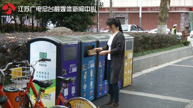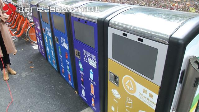 在南京的华侨路上,记者就看到了这样一个智能垃圾桶,相比以前的普通垃圾桶,他们的个子更高,而且有5个分类桶,分别投放报纸杂志,纸盒包装,易拉罐,饮料瓶,以及其他类的垃圾。相比以前大家可能不知道如何正确投放,现在在每个桶身上都有相应的物品标识,方便大家分辨,然后进行正确的分类投放。