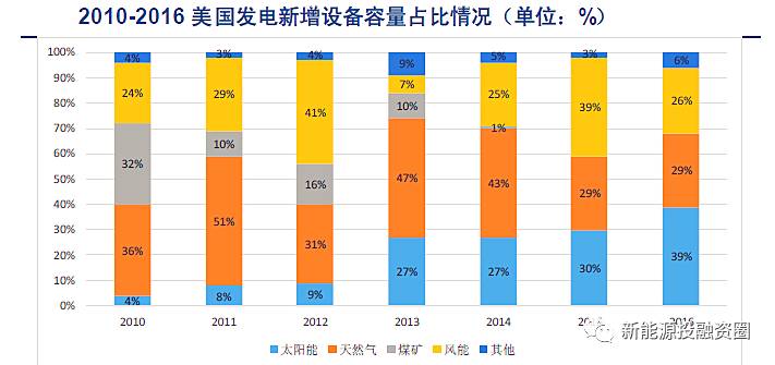 在美国,2016年新增发电设备中太阳能首次超越了风能和天然气,成为了新增发电设备中的最大贡献力量,高达39%。