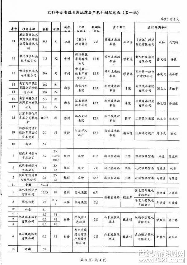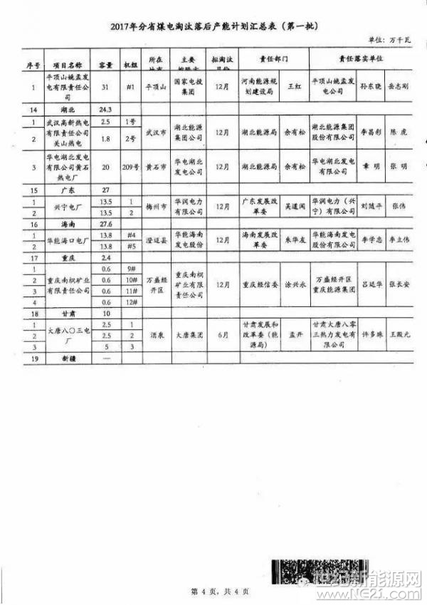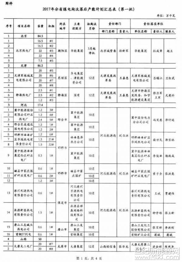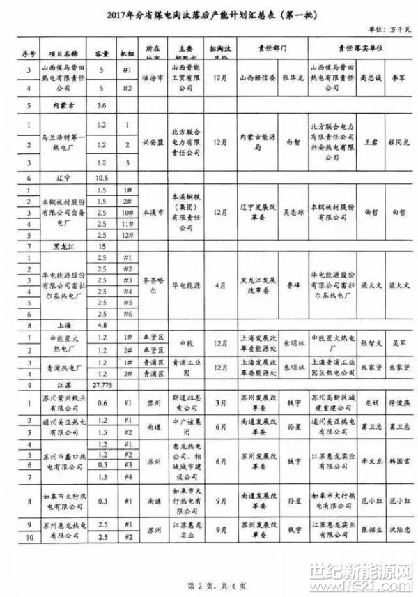 (另附,2017年第一批煤电淘汰落后产能计划汇总表)、
