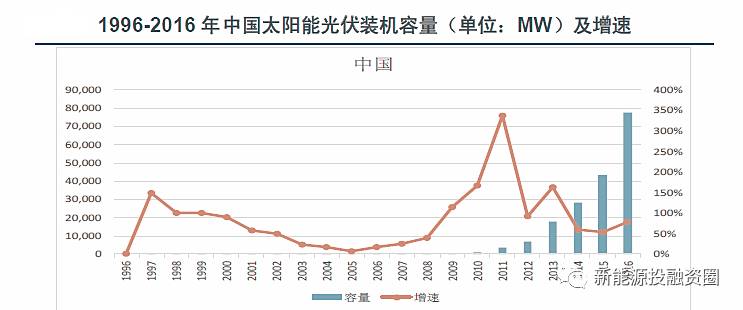 2015年中国首次在太阳能光伏装机量占比中排列世界领先地位,超过德国,成为全球光伏装机容量最大的国家。截止2016年年底,中国累计装机容量为77.9GW,占全球太阳能发电能力的四分之一。