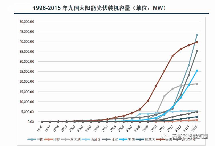 2013年到2015年,全球光伏行业市场发展速度与2012年之前相比已逐步放缓。2015年全球太阳能光伏装机容量已达230.61GW,较2014年的180.00GW增长约28.12%左右。欧洲市场装机量增速较缓,尽管英国光伏产业得以强劲增长,但德国和意大利市场的增长趋势明显低于其他市场水平。新兴市场方面,印度、南非、智利等市场均呈现迅猛发展态势,但由于基础装机容量较小,高速增长对于市场占有率的提升效应并不明显,2015年印度的装机量占比全球数量仅为1%。