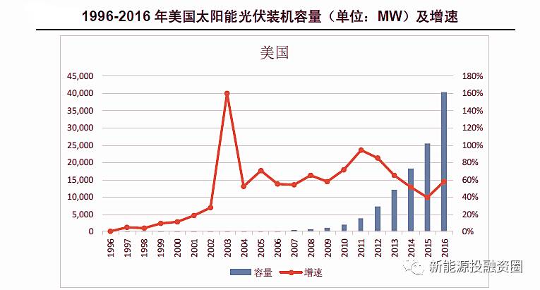 2016年美国新增光伏装机达到14.76GW,同比增长了57%以上。其中,规模化的商用光伏装机大幅上涨97%以上,自2011年以来首次超过了居民屋顶光伏装机。