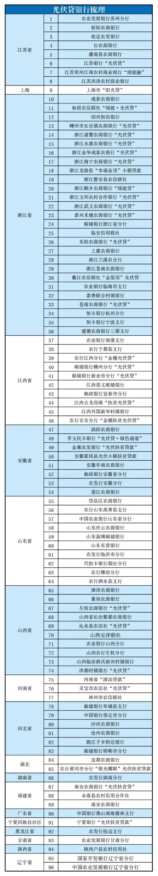 近期,国补降低成为光伏行业内热议的话题,补贴降了,电站安装费用也不是个小数目,有些老百姓只能“望电站而却步”。令人欣喜的是,一些地区政府部门联合地方银行共同开展“光伏贷”业务,为老百姓提供光伏贷款,消除了百姓当前资金不足的忧虑。近几天,向小编咨询光伏贷事宜的业主为数不少,在此,365光伏梳理了当前全国18个省市,96家开展光伏贷业务的银行,并以表格的形式清晰简单的呈现给大家,希望能为正想申请光伏贷的您提供一些参考。