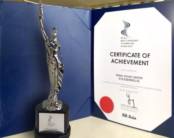 2017年10月27日,由亚洲权威商业杂志公司Business Media International发起的HR Asia Awards榜单揭晓。作为全球领先的太阳能整体解决方案提供商,天合光能从158家候选企业中脱颖而出,荣膺2017亚洲最佳企业雇主奖(“2017 BEST COMPANIES TO WORK FOR IN ASIA”)。