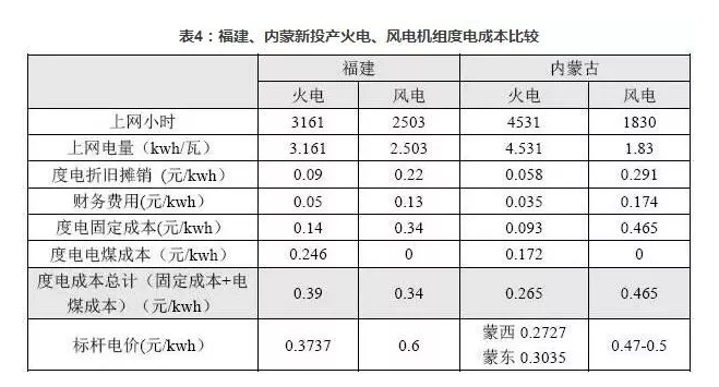 注:本模型相关参数取值为①普通燃煤火电机组单位投资为4元/瓦,风电机组为8元/瓦,固定资产折旧年限15年;②项目总投资中80%为债务性资金,借款利率为5%;③火电、风电机组上网小时取各地区2016年机组平均上网小时数;④福建标煤价格按防城港5500大卡折算820元/吨(2017年2月末),内蒙古标煤价格按包头市5600大卡煤价折算575元/吨,度电煤耗按300g/度;⑤不考虑维修、销售、管理费用等。
