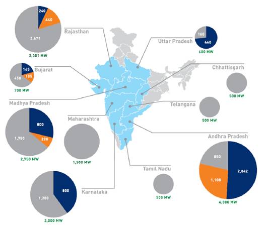 太阳能公园,印度政府计划于2020年建成共计40GW的太阳能公园,并提供12亿美元的资金支持,目前,已建成8.9GW。