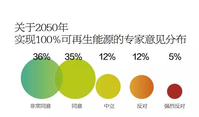 在REN21针对全球114名能源专家的调查中,所有专家都同意可再生能源开发规模将继续增长,但是,对于2050年全球经济社会是否能够100%依赖可再生能源,却并未形成共识。