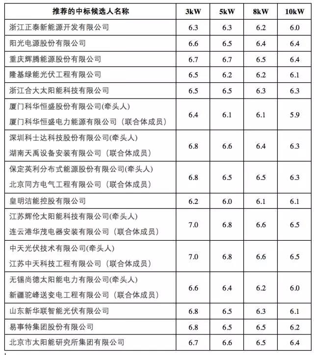 3kW入围报价单价范围:6.2元/W~7.0元/W