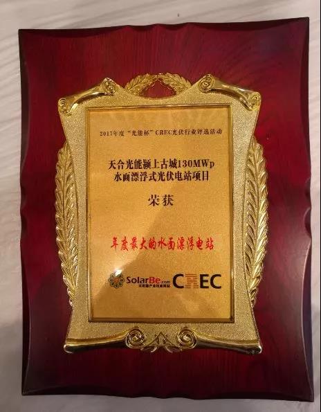 11月1日,由全球领先的太阳能整体解决方案提供商——天合光能所承建的“颍上古城130MW水面漂浮式光伏电站项目”在2017年“光能杯”&CREC光伏行业评选中荣获“年度最大水面漂浮电站奖项”。