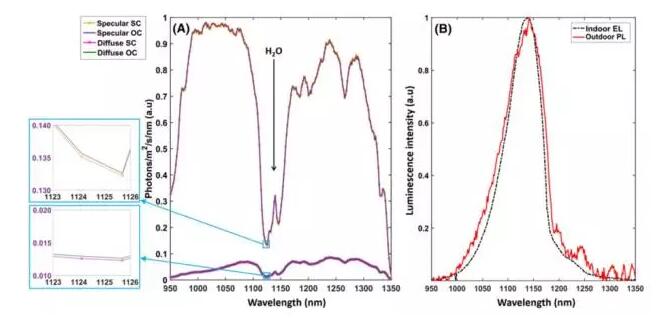 这是另一个精妙的设计。硅的光致发光,比起环境太阳光弱了太多了,信噪比非常非常低,基本上很难摘出有效信号来(PL是有用的,环境光是没有用的)。这也一直以来是技术上的难点。为了解决这个问题,研究人员盯上了1110到1170nm这个波段。在这个光谱的这个波段的太阳光能量非常低,因为这是大气中水蒸气的吸收峰。然而对于硅材料来说,PL发光可丝毫不受影响。所以在这个波段的信噪比完全已经达到了能够精确测量的程度。这里从室内EL和室外PL的信号比较也可以看的出来。不得不说,这也是大自然为户外光致发光技术开了一扇窗!