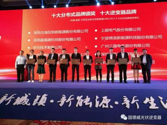 2017年11月3日,CREC2017 中国十大户用光伏品牌颁奖典礼在无锡成功举办。光伏行业领军企业固德威在众多竞选企业中脱颖而出,荣获“中国十大户用光伏逆变器品牌”奖项。