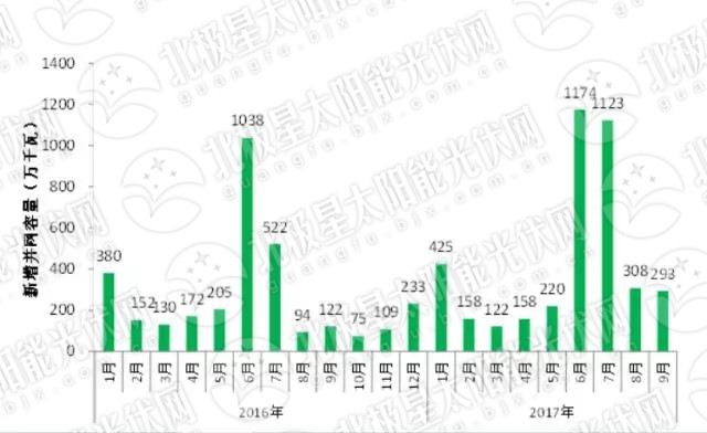 按这个口径我们进行了一下统计,上图是今年和去年1—9月份我们光伏新增装机的一个逐月数据图,大家看到6月份,因为“630”政策的影响,出现了一个抢装的高峰。但是今年的特点是“630”之后,到了7月份当月新增的规模仍然超过了1000万千瓦,8月份、9月份有所下降,,虽然8月、9月净增的大概是300万千瓦左右的规模,但是新增光伏中分布式光伏占比大概超过1/3。