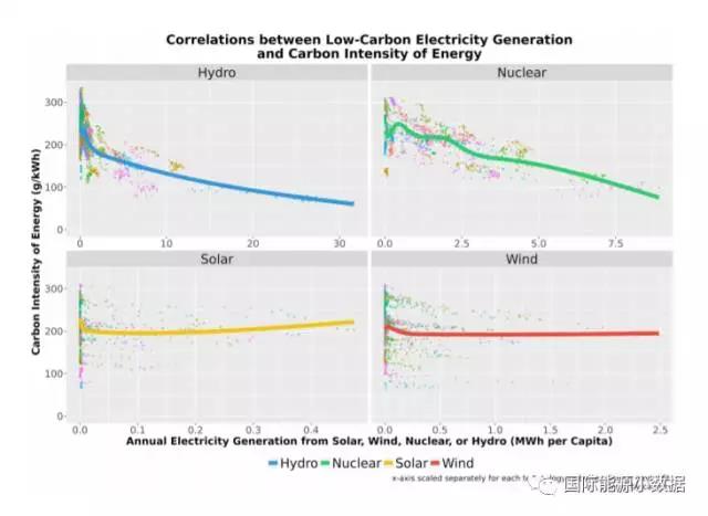 如下图所示,以68个国家的数据做回归分析,每当人均核电消费增加1兆瓦时,那么能源的碳强度(克二氧化碳/千瓦时)就会平均下降17.12克/千瓦时;每当人均水电消费增加1兆瓦时,那么能源的碳排放强度(克二氧化碳/千瓦时)就会平均下降8.14克/千瓦时。然而,整体而言人均太阳能光伏、风电消费的增加与碳排放强度没有明显的相关关系。