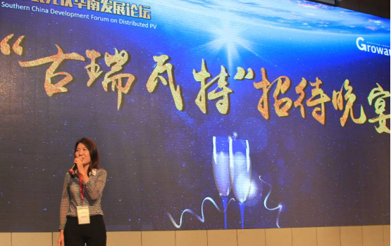 会议结束后,由古瑞瓦特冠名的招待晚宴在国际宴会厅隆重开宴,晚宴席间,高朋满座,气氛热烈。古瑞瓦特市场部总监张利霞进行晚宴致辞,对365光伏为光伏行业提供这样一个优质交流、合作、分享平台表示感谢,并表示广东省作为华南地区经济大省,企业众多,屋顶资源丰富,居民消费意识强,广东分布式市场一定大有可为。晚宴期间,古瑞瓦特逆变器作为大会终极大奖,引起现场轰动。