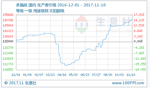 据生意社大宗榜数据显示,本周多晶硅市场价格继续上涨,涨幅为0.53%,周末国内企业对外报价平均在152000元/吨,当前价格同比去年下跌1.70%。