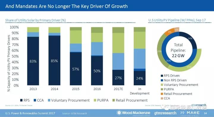 根据Wood Mackenzie等咨询公司的统计,政府的政策不再是美国光伏扩大应用的主要驱动力。如下图所示,2013年美国光伏装机的83%都源于企业为满足政府规定的可再生能源配额。这一比例逐年缩小,2015年为57%,2016年为50%,预计2017年仅有27%的装机由可再生能源配额制驱动。截至2017年9月,正在建设中的24吉瓦光伏装机中,还剩下24%由可再生能源配额制驱动,其他35%是电力企业自行采购,12%来自居民和社区的采购;此外还有29%属于“公共事业管制法(Public Utility Regulatory Policies Act, PURPA)”所鼓励的市场竞争开放条款下签订的采购合同。