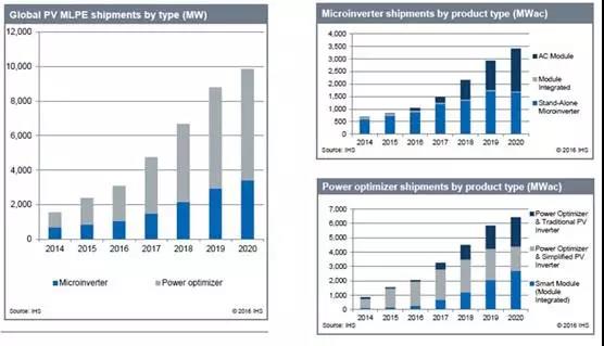 目前全球市场体量在2016年为3GW左右,截止到2020年将会接近10GW。截止到2020年,微型逆变器系列的主流产品交流组件和独立微逆将会平分秋色;而优化器系列产品将出现三足鼎立的局面,分别是优化器结合常规逆变器、优化器结合简化版逆变器及智能组件。