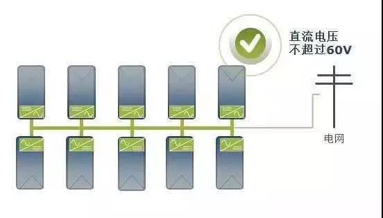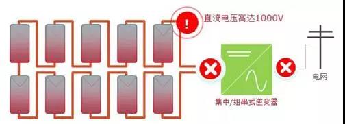 微型逆变器技术采用全并联电路设计,组件之间不再有电压叠加,直流电压小于60伏(不高于组件最高输出直流电压),彻底解决了由于高压直流拉弧引起火灾的风险,同时也解决了当房屋起火时,因光伏电站而阻碍了施救的问题。