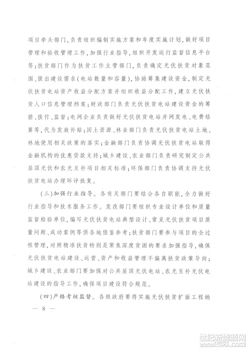 6月23日,习近平总书记在深度贫困地区脱贫攻坚座谈会上再次强调指出“在具备光热条件的地方实施光伏扶贫,建设村级光伏电站,通过收益形成村集体经济,开展公益岗位扶贫、小型公益事业扶贫、奖励补助扶贫,这些是解决深度贫困的好办法”。根据中央脱贫攻坚决策部署和中央领导同志关于光伏扶贫的重要论述,国务院扶贫办会同各部委在2017年出台了或即将出台一系列光伏扶贫配套政策:会同国家能源局出台《关于“十三五”光伏扶贫计划编制有关事项的通知》并即将出台《光伏扶贫电站管理办法》,会同国土资源部即将出台《关于促进光伏发电产业健康发展用地的意见》,指导国家电网公司、南方电网公司研究出台简化电费结算流程、提高发电并网消纳方面的支持政策。同时,国务院扶贫办正在制定《光伏扶贫电站收益分配管理办法》,规范和完善光伏扶贫收益分配机制,并在会同国家标准委制定光伏扶贫国家标准的基础上发布光伏扶贫工作指南,进一步强化对各地开展光伏扶贫的指导和监管。