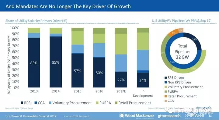 根据Wood Mackenzie等咨询公司的统计,政府的政策不再是美国光伏扩大应用的主要驱动力。如下图所示,2013年美国光伏装机的83%都源于企业为满足政府规定的可再生能源配额。这一比例逐年缩小,2015年为57%,2016年为50%,预计2017年仅有27%的装机由可再生能源配额制驱动。截至2017年9月,正在建设中的24吉瓦光伏装机中,还剩下24%由可再生能源配额制驱动,其他35%是电力企业自行采购,12%来自居民和社区的采购;此外还有29%属于“公共事业管制法(Public Utility Regulatory Policies Act, PURPA)”所鼓励的市场竞争开放条款下签订的采购合同。