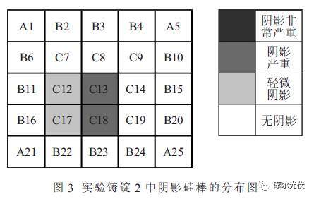 实验锭1中心区域硅棒C13尾部阴影高度在90mm左右,截去头尾少子红区,阴影高度约45mm,阴影主要分布在硅锭的中心C区,颜色较深。