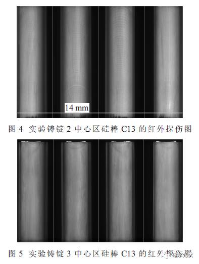 从图3和图4看到,多晶硅锭内部的阴影分布情况已经有大幅改善,出现含阴影硅棒根数也在减少,尾部红区截断后硅棒阴影高度已经由第1次实验的45mm下降至14mm。
