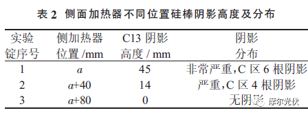 在其他实验条件不变的情况下,侧面加热器位置a分别下移0mm、40mm和80mm后,硅锭中心区硅棒阴影分布情况及中心硅棒C13的阴影高度数据结果汇总见表2。