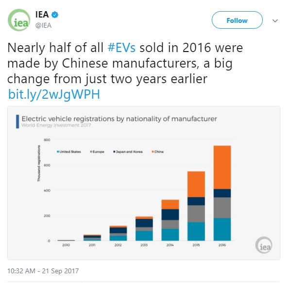 在电动汽车方面,中国已经做到全球行业发展的领跑者。2016年中国销售电动汽车33.6万辆,几乎是全球销售总量的一半,中国新能源汽车的保有量也在全球占比过半。