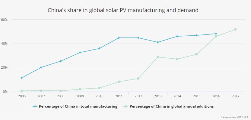 国际能源署(IEA)在2017年可再生能源报告中称,中国已占全球太阳能电池制造总产能的60%,占全球光伏装置使用和需求的50%。2016年,全球范围光伏装置的增长率首次超过其他能源载体,主要原因就是中国带领美国和印度的光伏装置增加。因此,中国的市场和政策变化,将影响到全球光伏装置的供求与价格。