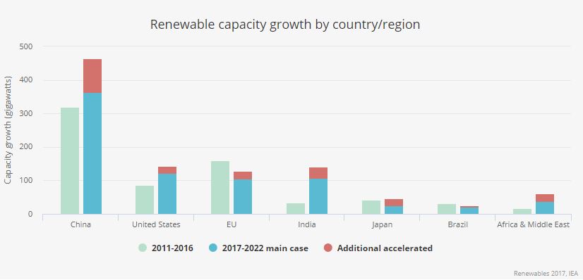 IEA可再生能源报告格外指出,尽管美国依旧保持全球可再生能源增长市场第二大的地位,但特朗普政府的税改、国际贸易和能源政策存在较大不确定性,可能会改变行业经济和未来扩张预期。