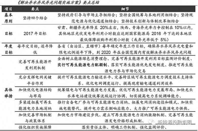 《解决弃水弃风弃光问题实施方案》发布。2017年11月13日,国家能源局、国家发改委正式下发《解决弃水弃风弃光问题实施方案》(以下简称《方案》),明确按年度实施可再生能源电力配额制,并在2020年全国范围内有效解决弃水弃风弃光问题。方案共13页,内容达27条之多,解决“三弃”(弃水弃风弃光)问题的难度可见一斑。我们认为《方案》主要有以下三个亮点:(1)制定了2017年的目标,并提出各地要逐年下调目标,以在2020年全国范围内有效解决“三弃”问题;(2)明确按年度实施可再生能源电力配额制,并明确了配额的考核主体;(3)再次重申解决“三弃”问题的重要性。