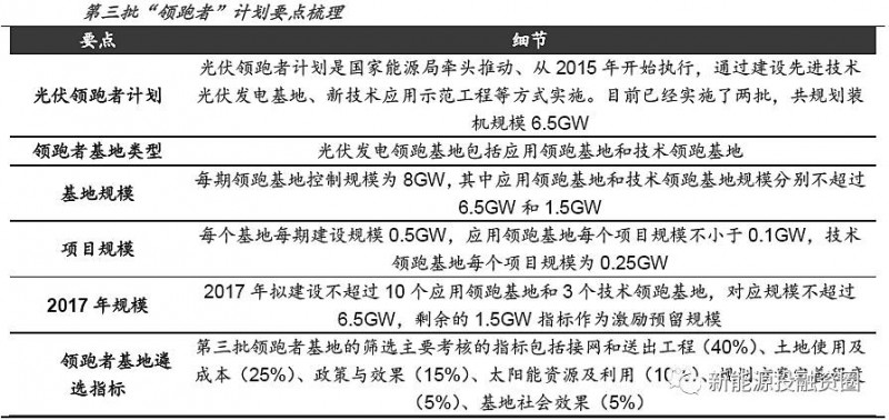 第三批“领跑者”计划公布。2017年9月22日,国家能源局发布《关于推进光伏发电“领跑者”计划实施和2017年领跑基地建设有关要求的通知》,光伏发电领跑基地包括应用领跑基地和技术领跑基地,每期领跑基地控制规模为8GW,其中应用领跑基地和技术领跑基地规模分别不超过6.5GW和1.5GW。每个基地每期建设规模0.5GW,应用领跑基地每个项目规模不小于0.1GW,技术领跑基地每个项目规模为0.25GW,2017年拟建设不超过10个应用领跑基地和3个技术领跑基地,对应规模不超过6.5GW,剩余的1.5GW指标作为激励预留规模。