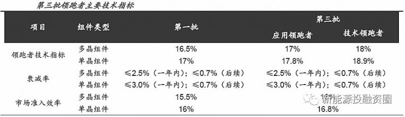 第三批领跑者计划与前两批的区别?第三批领跑者计划除了之前的应用领跑者基地之外,还首次提出了技术领跑者基地,每期的规划规模为1.5GW,对应3个领跑者基地和6个项目。应用领跑者基地的目的是加速已量产的高效产品的市场推广,而技术领跑基地通过给光伏制造企业自主创新研发、可推广应用但尚未批量制造的前沿技术和突破性技术产品提供试验示范和依托工程,以加速科技研发成果应用转化,带动和引领光伏发电技术进步和市场应用。在投资企业的选择上,技术领跑者主要考察企业的技术和产业先进性(55%)、技术方案(25%)、业绩水平(10%)和投资能力(10%),并不考察上网电价,技术领跑者基地的上网电价执行所在地的光伏标杆上网电价;而应用领跑者主要考察企业的上网电价(35%)、技术与产业先进性(20%)、业绩水平(20%)、技术方案(15%)和投资能力(10%)。在技术指标的设置上,领跑者基地技术指标不定期更新,应用领跑者技术指标将作为市场准入标准参考,而技术领跑者的技术指标作为下期应用领跑者基地的技术指标参考。两级领跑者的配置很好地践行了“研发一代、量产一代、推广一代”的新技术研发和推广方式,在两级领跑者配置的带动下,行业格局将发生变化,高效化进程将进一步加速,技术实力雄厚的龙头企业将受益,强者恒强。