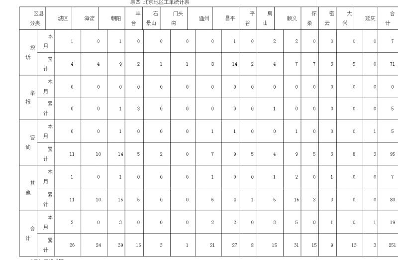 本月,北京地区工单共19件,其中投诉7件,咨询5件,其他7件。(北京地区工单统计表见表四)