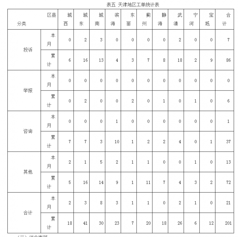本月,天津地区工单共21件,其中投诉7件,咨询1件,其他13件。(天津地区工单统计表见表五)