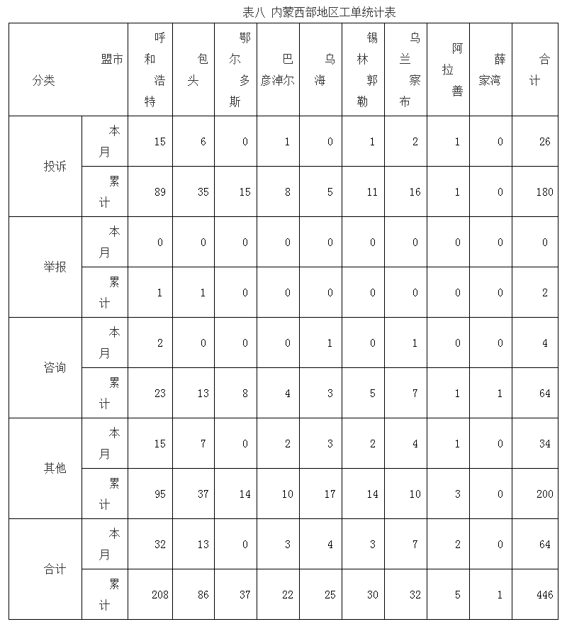 本月,内蒙西部地区工单共64件,其中投诉26件,咨询4件,其他34件。(内蒙西部地区工单统计表见表八)