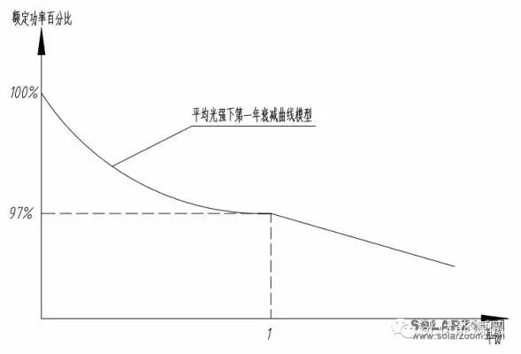 所以在理论计算上,发电量模拟计算的额定功率起始点可以等同于光伏组件出厂时的额定功率,而且一年内组件的衰减可视为线性衰减。