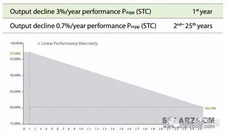 对于晶硅组件,一般第一年最大衰减值为3%,此后每年为0.7%