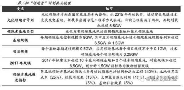 第三批“领跑者”计划公布。2017年9月22日,国家能源局发布《关于推进光伏发电“领跑者”计划实施和2017年领跑基地建设有关要求的通知》,光伏发电领跑基地包括应用领跑基地和技术领跑基地,每期领跑基地控制规模为8GW,其中应用领跑基地和技术领跑基地规模分别不超过6.5GW和1.5GW。每个基地每期建设规模0.5GW,应用领跑基地每个项目规模不小于0.1GW,技术领跑基地每个项目规模为0.25GW,2017年拟建设不超过10个应用领跑基地和3个技术领跑基地,对应规模不超过6.5GW,剩余的1.5GW指标作为激励预留规模。
