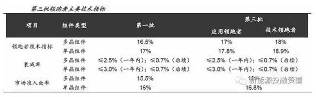 第三批领跑者计划与前两批的区别?第三批领跑者计划除了之前的应用领跑者基地之外,还首次提出了技术领跑者基地,每期的规划规模为1.5GW,对应3个领跑者基地和6个项目。应用领跑者基地的目的是加速已量产的高效产品的市场推广,而技术领跑基地通过给光伏制造企业自主创新研发、可推广应用但尚未批量制造的前沿技术和突破性技术产品提供试验示范和依托工程,以加速科技研发成果应用转化,带动和引领光伏发电技术进步和市场应用。在投资企业的选择上,技术领跑者主要考察企业的技术和产业先进性(55%)、技术方案(25%)、业绩水平(10%)和投资能力(10%),并不考察上网电价,技术领跑者基地的上网电价执行所在地的光伏标杆上网电价;而应用领跑者主要考察企业的上网电价(35%)、技术与产业先进性(20%)、业绩水平(20%)、技术方案(15%)和投资能力(10%)。在技术指标的设置上,领跑者基地技术指标不定期更新,应用领跑者技术指标将作为市场准入标准参考,而技术领跑者的技术指标作为下期应用领跑者基地的技术指标参考。两级领跑者的配置很好地践行了“研发一代、量产一代、推广一代”的新技术研发和推广方式,在两级领跑者配置的带动下,行业格局将发生变化,高效化进程将进一步加速,技术实力雄厚的龙头企业将受益,强者恒强。