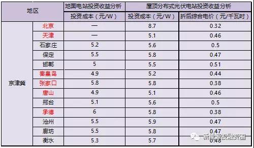 由于河北2017年指标全部用于光伏扶贫,所以本篇地面光伏按扶贫进行测算。根据上述模型参数测算地面电站投资成本(元/W),见最后表格。北京天津由于土地受限,集中式电站很难落地,所以本文不予考虑。