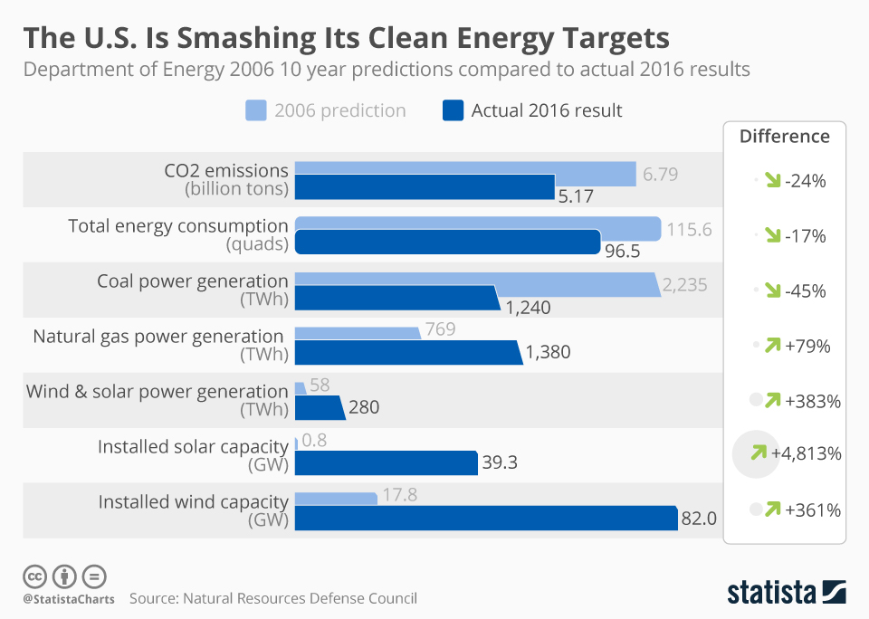 美国数据供应商Statista称,2016年,二氧化碳实际排放,比十年前的预期少了24%。煤炭发电量比预期的要低45%,而天然气发电比预期的高出79%。