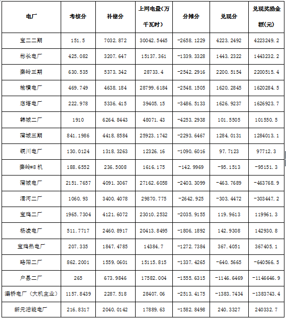 根据《关于印发<西北区域发电厂并网运行管理实施细则>及<西北区域并网发电厂辅助服务管理实施细则>的通知》(西北监能市场〔2015〕28号)规定,2017年9月份陕西电网发电厂并网考核和辅助服务补偿结果复核工作已完成,现予公布,请依据附件结算。