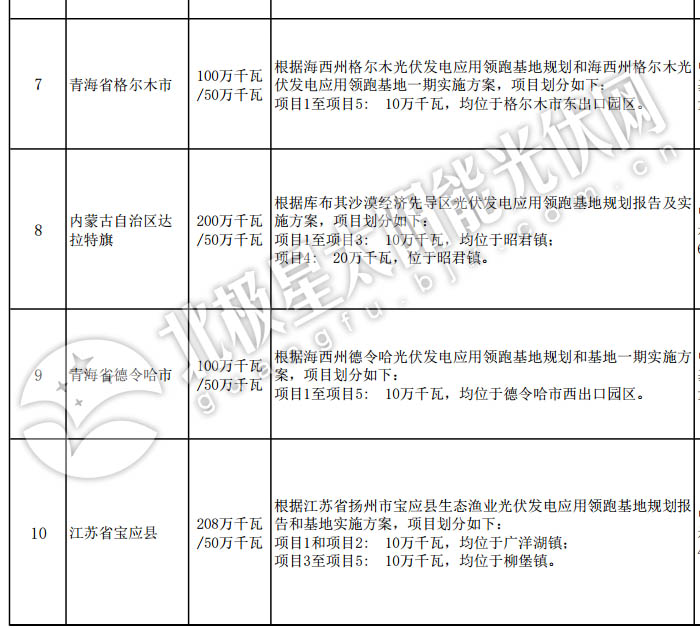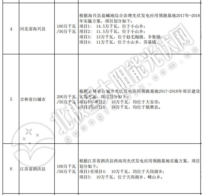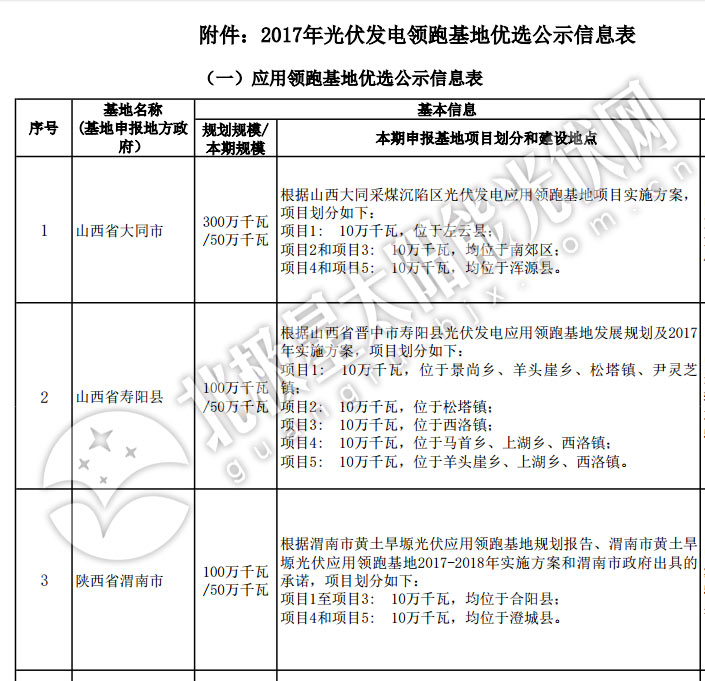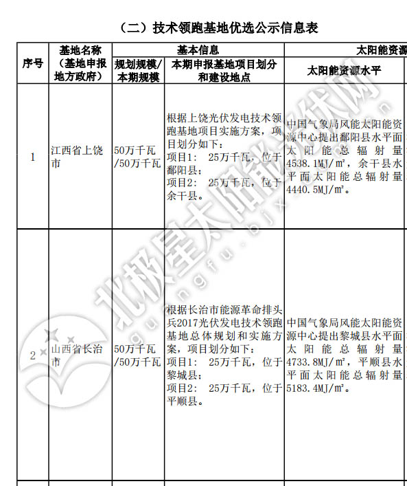 索比光伏网讯:根据《国家能源局关于推进光伏发电“领跑者”计划实施和2017年领跑基地建设有关要求的通知》(国能发新能[2017]54号,简称《通知》),2017年拟建设不超过10个应用领跑基地和3个技术领跑基地。按照《通知》规定及有关要求,在对有关省(自治区)发展改革委(能源局)申报文件进行初步形式审查的基础上,我局委托技术管理机构组织专家遵循公平公正、科学客观的原则开展了基地优选工作,经竞争择优和我局审核,提出了2017年光伏发电应用领跑基地和技术领跑基地拟入选名单(见附件),现予以公示。