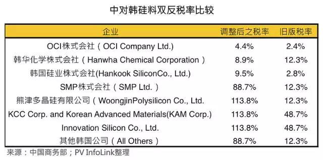 中国商务部于11月21日发布韩国多晶硅倾销期中复审公告,与旧版税率相比,OCI由2.4%微幅提升至4.4%,韩华化学由12.3%降至8.9%,韩国硅业则由2.8%提升至9.5%。