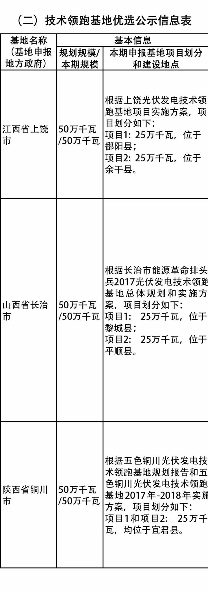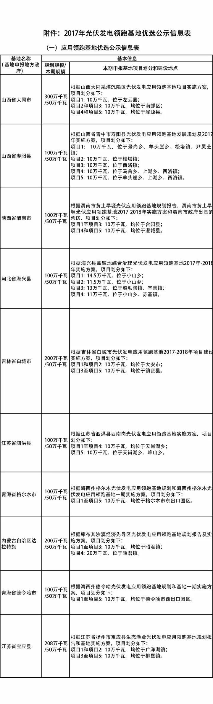 根据《国家能源局关于推进光伏发电“领跑者”计划实施和2017年领跑基地建设有关要求的通知》(国能发新能[2017]54号,简称《通知》),2017年拟建设不超过10个应用领跑基地和3个技术领跑基地。按照《通知》规定及有关要求,在对有关省(自治区)发展改革委(能源局)申报文件进行初步形式审查的基础上,我局委托技术管理机构组织专家遵循公平公正、科学客观的原则开展了基地优选工作,经竞争择优和我局审核,提出了2017年光伏发电应用领跑基地和技术领跑基地拟入选名单(见附件),现予以公示。