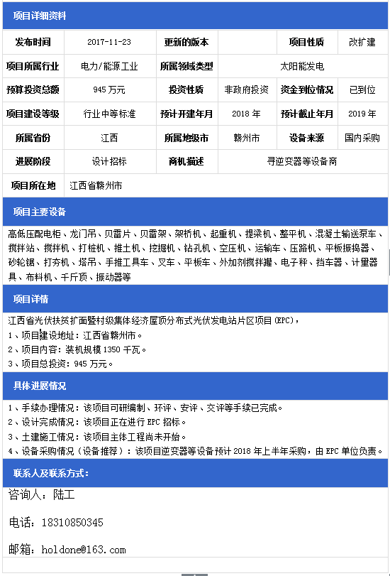 大唐130MW光伏项目EPC总包招标11月5日,大唐福建福安溪尾80MW渔光互补光伏电站新建项目工程EPC总承包招标公告发布,招标人为福建大唐国际宁德发电有限责任公司。大唐重庆50MW光伏项目EPC总包二次招标11月4日,大唐重庆铜梁区善心50MW农光互补光伏发电新建项目EPC总承包二次招标公告发布,招标人为渝能(集团)有限责任公司。