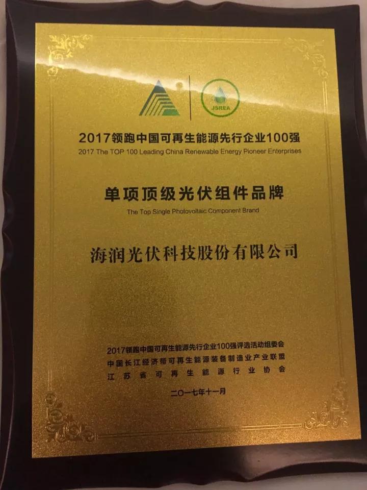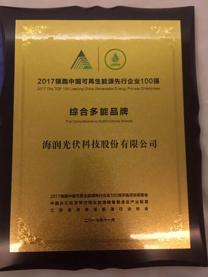11月24日,2017年领跑中国可再生能源先行企业100强颁奖典礼在南京隆重召开。本次评选活动围绕创新、协调、绿色、开放、共享五大发展理念,着力推进可再生能源领域供给侧结构性改革,激励全国广大可再生能源企业和企业家坚持创新驱动发展战略,加快实现转型升级,不断提升可再生能源企业发展质量和效益。海润光伏以优秀的组件性能,卓越的光伏项目开发能力以及不断创新的企业经营理念,分别荣获“综合多能品牌奖牌”、“单项顶级光伏组件品牌奖牌”、“2017年领跑中国可再生能源先行企业100强 优秀企业家奖杯”三项大奖。
