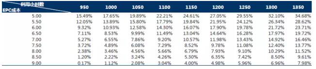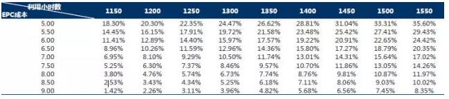 表2:II类地区大型光伏电站IRR对于EPC和利用小时的敏感度分析(单位:元/W,小时)